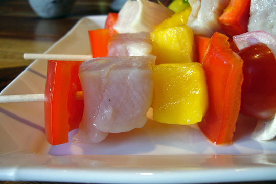 Résultat: des brochettes de poisson cru! Honnêtement, le plat a besoin d’être amélioré: alors que l’oignon donne une délicieuse saveur au ceviche, en brochette, c’est assez ordinaire de croquer dans un gros morceau, même en choisissant de délicates échalotes. J’aurais peut-être dû y mettre de l’oignon vert, faire plus de place aux fruits… Bref, à améliorer, mais bien bon quand même.